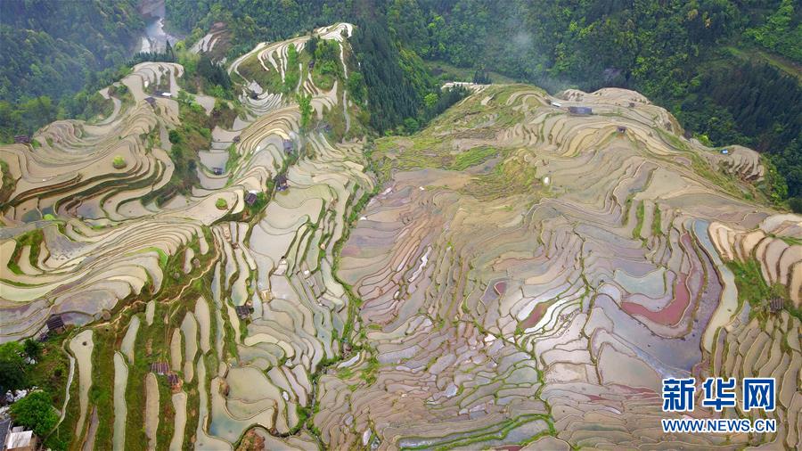这是4月17日拍摄的从江县加榜乡的梯田(无人机照片)。 暮春时节,位于贵州省从江县加榜乡的党扭、加车、加页等苗寨的梯田蓄水丰盈,色彩斑斓,景色优美。 新华社记者 杨文斌 摄
