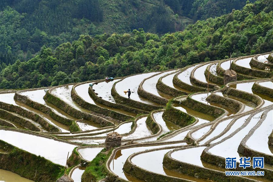 4月16日,村民走在从江县加榜乡的梯田上。 暮春时节,位于贵州省从江县加榜乡的党扭、加车、加页等苗寨的梯田蓄水丰盈,色彩斑斓,景色优美。 新华社记者 杨文斌 摄