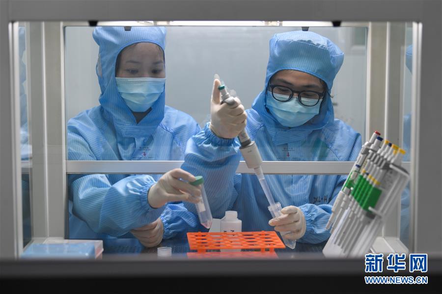 在江苏硕世生物科技股份有限公司,工作人员在分装新冠病毒核酸检测试剂产品(4月16日摄)。新华社记者李博摄