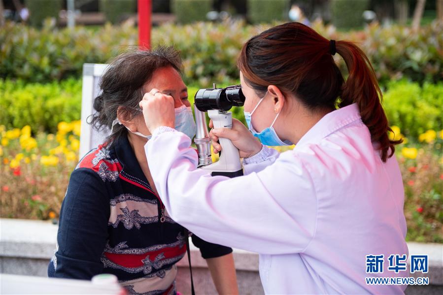 4月17日,在衡阳市太阳广场,眼科医生给市民检查眼睛。新华社发(陈思汗摄)