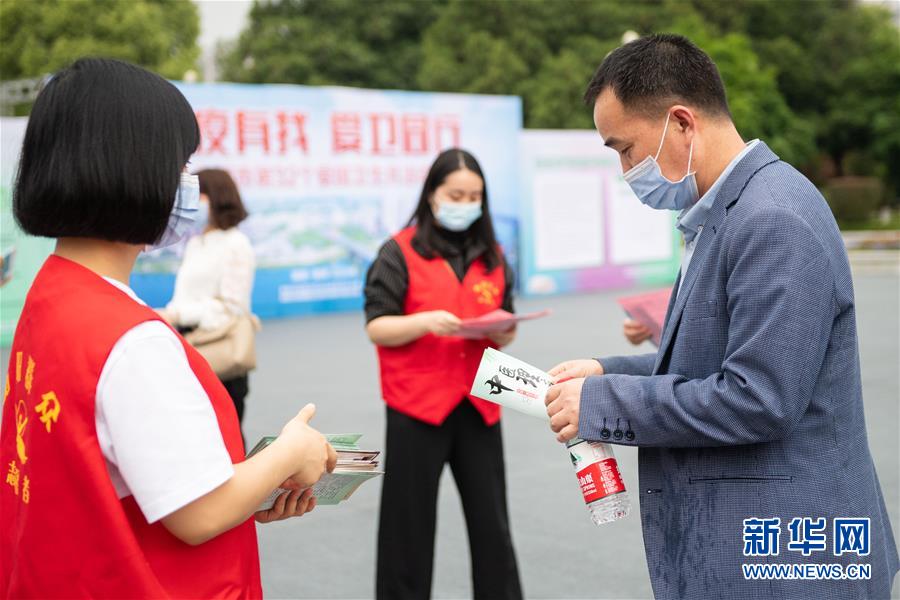 4月17日,在衡阳市太阳广场,志愿者(左)给市民发放爱卫宣传单。 新华社发(陈思汗摄)