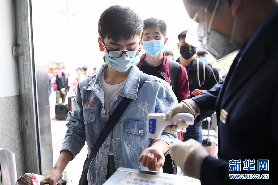 4月17日,塔里木大学的学生在兰州火车站进站口测温后进站。 当日,中国铁路兰州局集团有限公司又一趟“点对点”学生专列K4097次列车开行,运送兰州、武威、张掖、酒泉等地的学生前往新疆阿克苏返校复学。 新华社记者 陈斌 摄