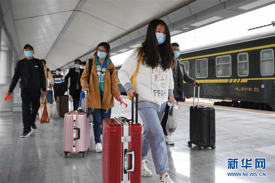 4月17日,塔里木大学的学生准备从兰州火车站登上学生专列出发。 当日,中国铁路兰州局集团有限公司又一趟“点对点”学生专列K4097次列车开行,运送兰州、武威、张掖、酒泉等地的学生前往新疆阿克苏返校复学。 新华社记者 陈斌 摄