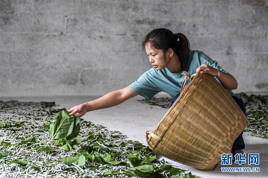 4月17日,广西凌云县下甲镇平怀村村民给蚕虫喂食桑叶。 新华社记者 曹祎铭 摄