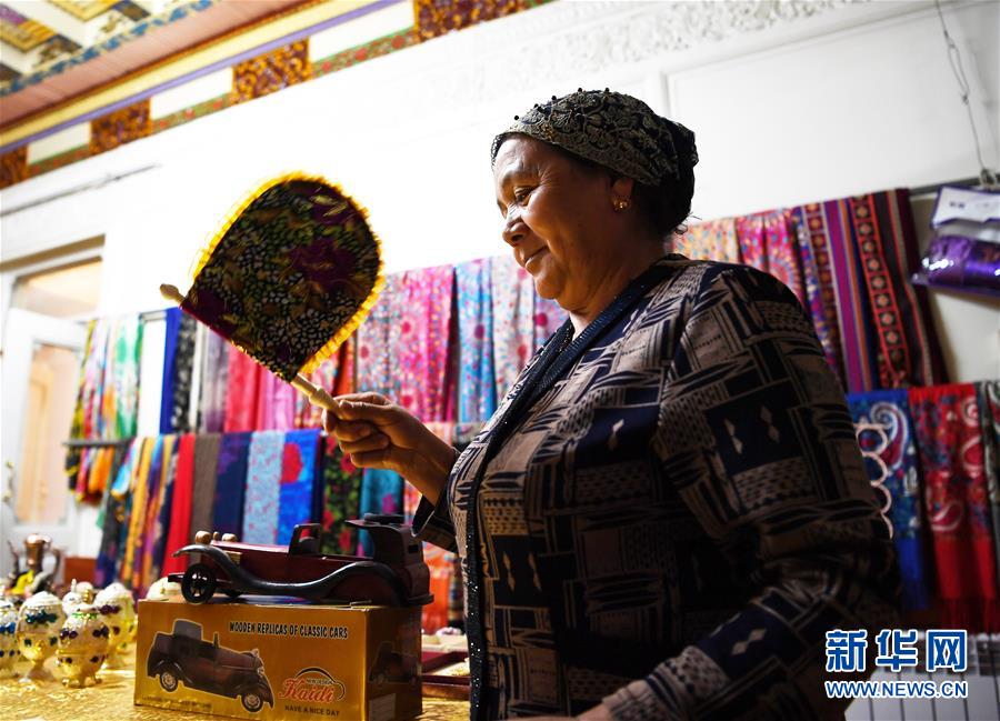 在新疆伊宁市喀赞其民俗旅游区,阿瓦古丽·卡地尔展示“手摇扇”(4月8日摄)。 新华社记者 宋彦桦 摄