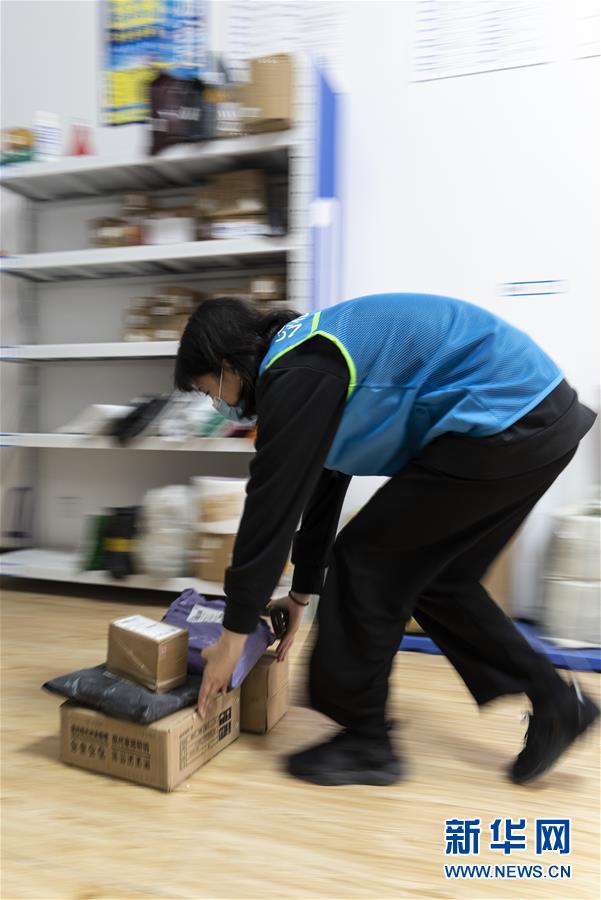 4月17日,在四川省简阳市的一家菜鸟驿站,马海燕在运送快递货品。 新华社记者 李梦馨 摄