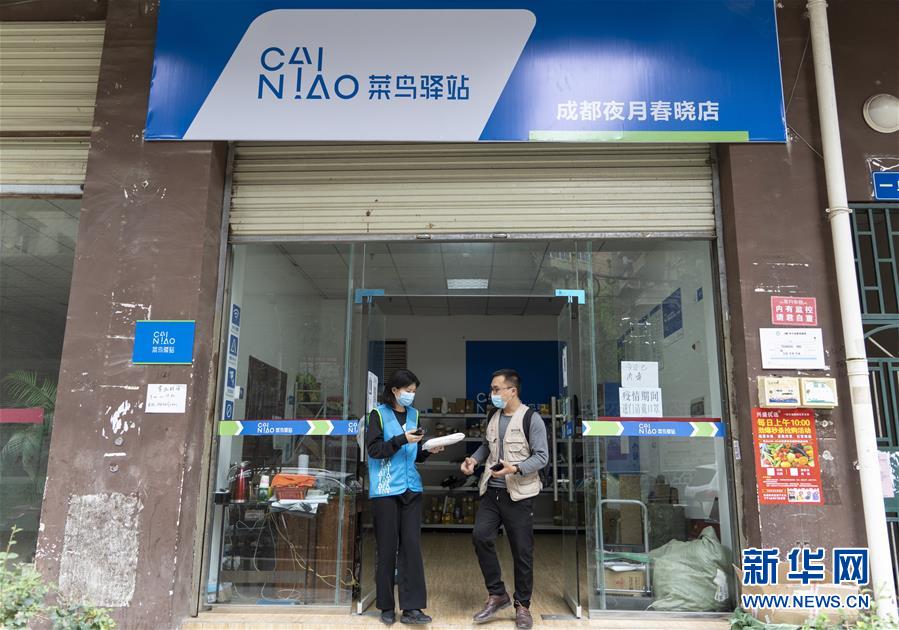 4月17日,在四川省简阳市的一家菜鸟驿站,马海燕(左)帮客人取件。 新华社记者 李梦馨 摄