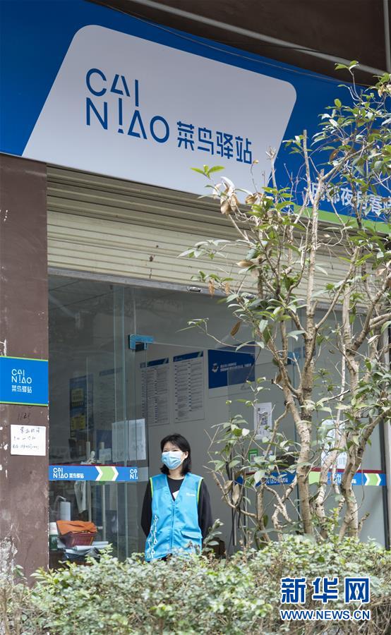 4月17日,在四川省简阳市的一家菜鸟驿站,马海燕在店外休息。 新华社记者 李梦馨 摄