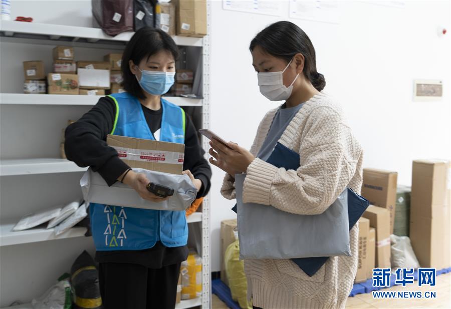 4月17日,在四川省简阳市的一家菜鸟驿站,马海燕(左)帮客人取件。 新华社记者 李梦馨 摄