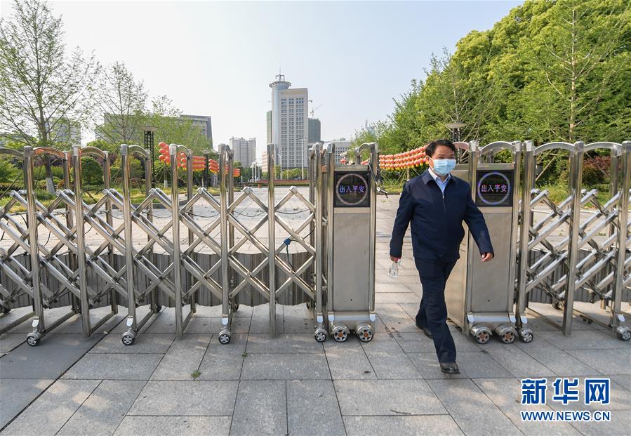 方勤馆长手持酒精喷壶在湖北省博物馆园区内巡视(4月16日摄)。 新华社记者 李贺 摄
