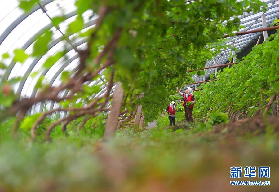4月17日,唐山市曹妃甸区九农场的农民在大棚内管护葡萄。新华社记者 杨世尧 摄