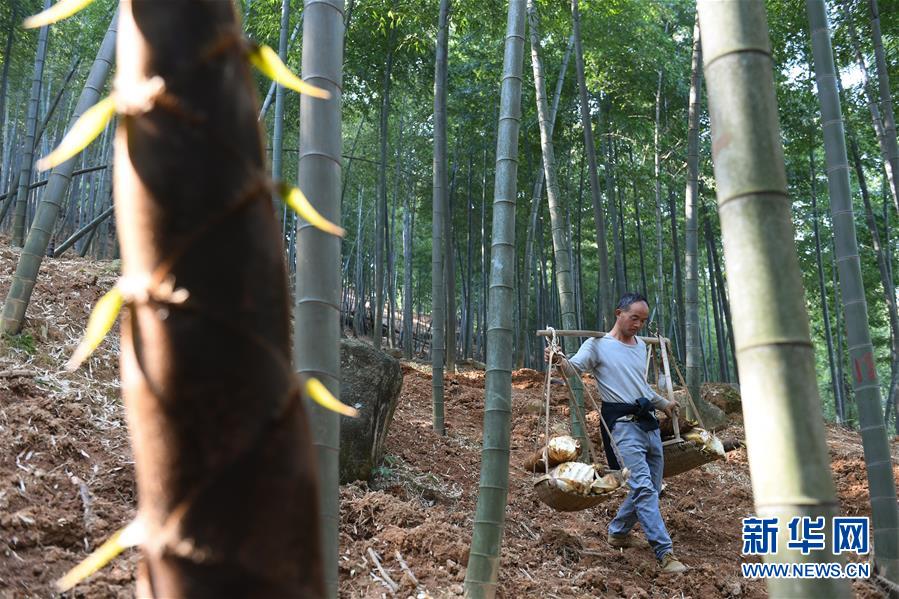 4月14日,长塘镇村民罗元祥在竹林里挑笋。 近期,在浙江绍兴上虞区传统竹产区长塘镇竹林里,农民们忙着收获竹笋。长塘镇竹林面积1.5万亩,竹笋年产量约3万吨,是当地农民重要的经济来源。 新华社记者 翁忻旸 摄