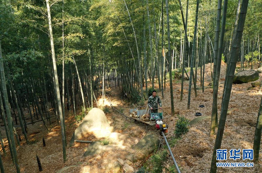 4月14日,村民乘坐竹林小火车运送竹笋(无人机照片)。 近期,在浙江绍兴上虞区传统竹产区长塘镇竹林里,农民们忙着收获竹笋。长塘镇竹林面积1.5万亩,竹笋年产量约3万吨,是当地农民重要的经济来源。 新华社记者 翁忻旸 摄