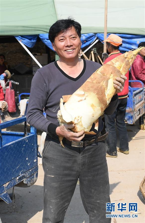 4月14日,长塘镇会篁村村民罗新华怀抱一棵大笋来合作社售卖。 近期,在浙江绍兴上虞区传统竹产区长塘镇竹林里,农民们忙着收获竹笋。长塘镇竹林面积1.5万亩,竹笋年产量约3万吨,是当地农民重要的经济来源。 新华社记者 翁忻旸 摄