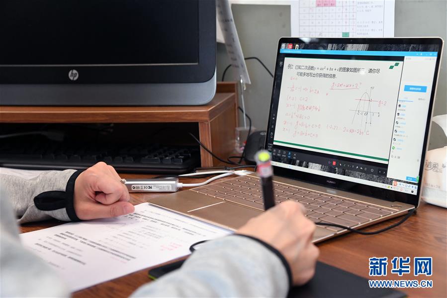4月14日,在北京科技大学附属中学,初中数学老师王晶在为学生上初三数学课。 受新冠肺炎疫情影响,北京市中小学延期开学。根据北京市教委相关要求,从4月13日起,北京中小学生开启居家防疫与线上学科学习相结合的新阶段。 新华社记者 任超 摄