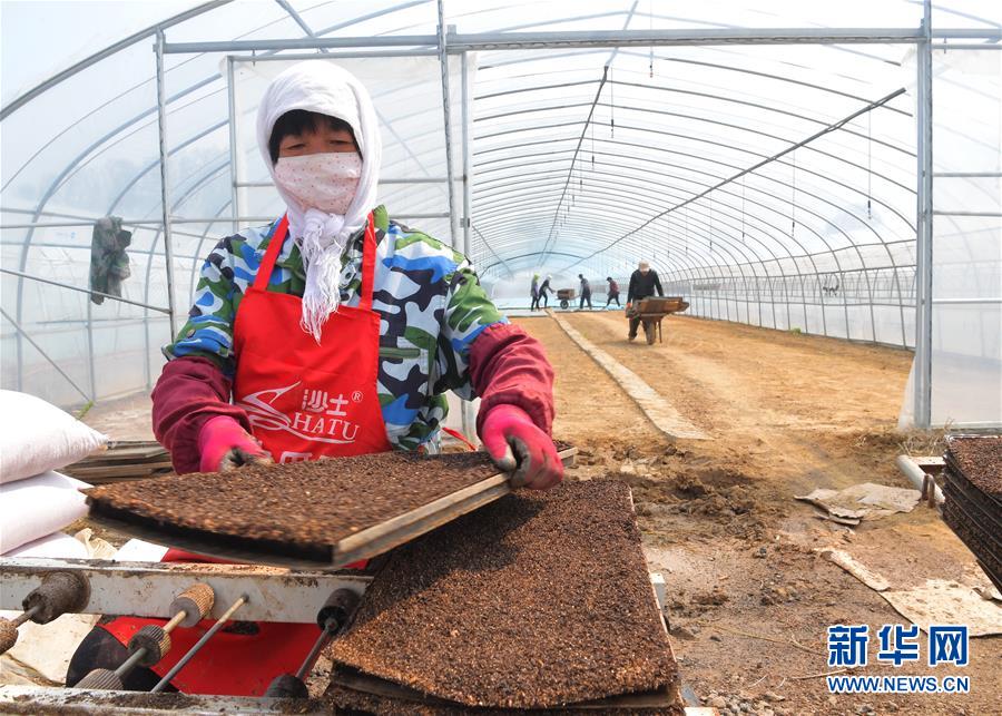 4月17日,唐山市曹妃甸区一家有机水稻种植合作社的社员在搬运撒好稻谷种的育苗盘。新华社记者 杨世尧 摄