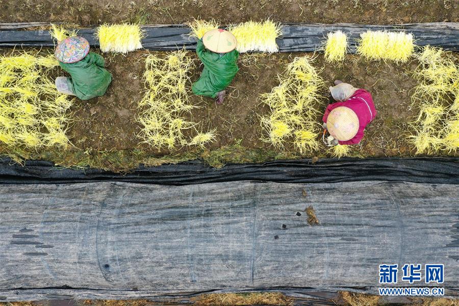 4月17日,在靖江市生祠镇东进村,村民收获韭黄(无人机照片)。