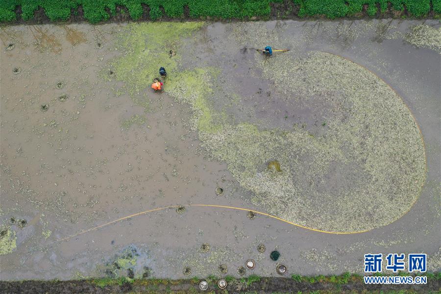 4月17日,在靖江市生祠镇东进村,村民收获茨菇(无人机照片)。
