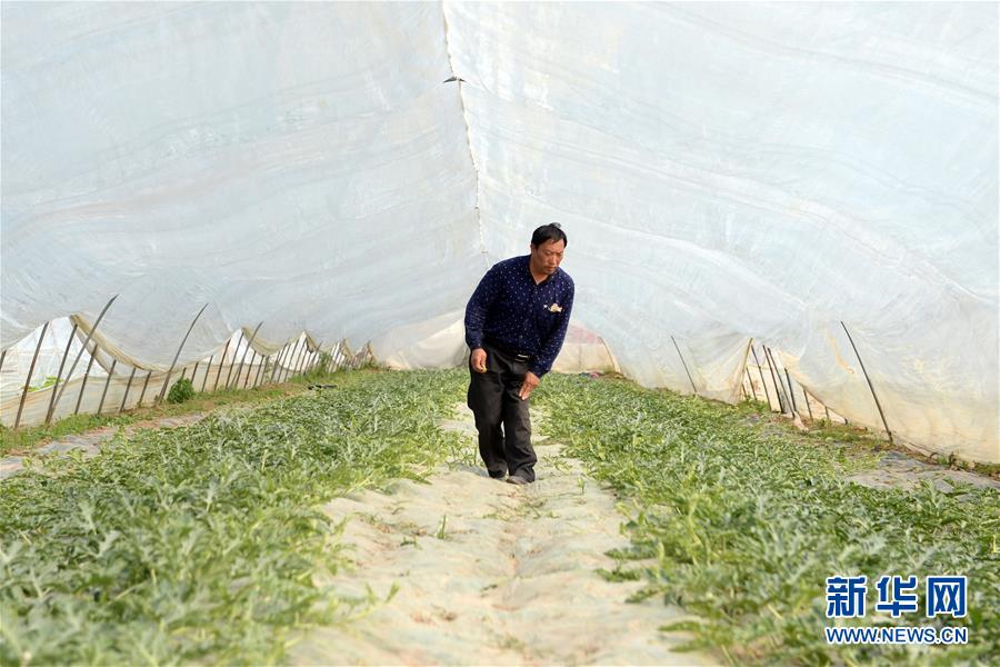 4月2日,孙勇在大棚内查看西瓜长势。 新华社发(黄博涵摄)