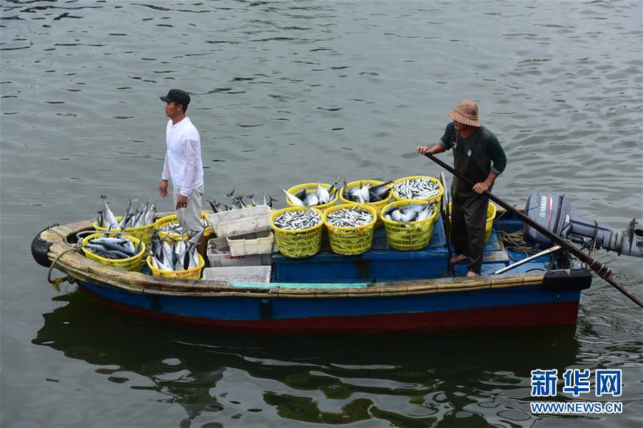 4月18日,在海南省琼海市潭门港,一只接驳小船满载而归。 随着海南渔业陆续复工复产,每日清晨,大批满载而归的渔船返回琼海市潭门港码头卸货,码头上一派繁忙景象。 新华社发(蒙钟德 摄)