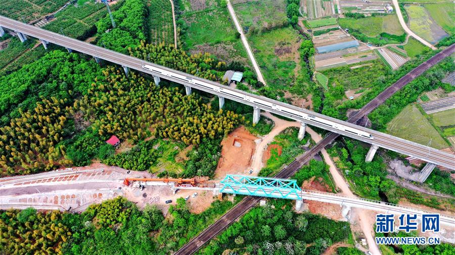 4月18日,在金台铁路永康江特大桥建设现场,工人们在架设最后一孔预制T梁(无人机照片)。新华社发(王华斌 摄)