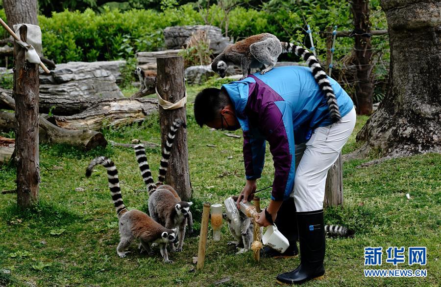 4月18日,上海动物园饲养员张益顺在特制的环尾狐猴饲喂器里投放食物。 上海动物园根据各类动物的生物学特性和原栖息地特点,采取模仿环境设计、改善投喂方式、增加取食难度、提供新颖玩具等“丰容”方式,丰富动物们的日常生活内容,促进它们展示更多自然行为。 新华社记者 张建松 摄