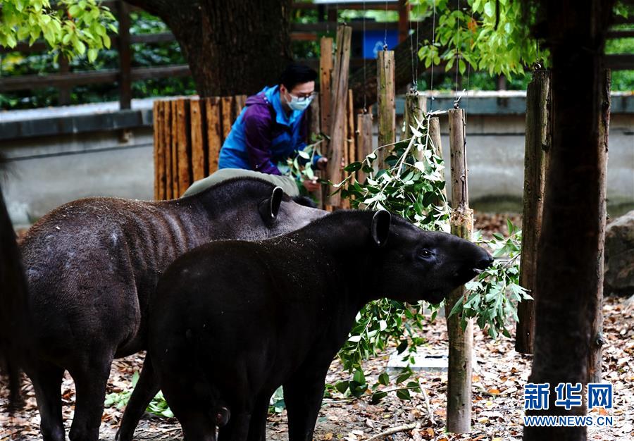 4月18日,上海动物园的南美貘在悬挂的竹筒上觅食。 上海动物园根据各类动物的生物学特性和原栖息地特点,采取模仿环境设计、改善投喂方式、增加取食难度、提供新颖玩具等“丰容”方式,丰富动物们的日常生活内容,促进它们展示更多自然行为。 新华社记者 张建松 摄