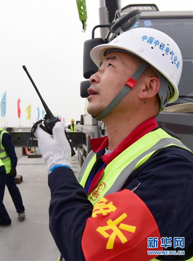 4月18日,中铁电气化局工程人员在现场施工。 当日,由中铁电气化局承建的太(原)焦(作)高铁河南段接触网第一杆在河南省焦作市境内顺利安装,标志着太焦高铁进入电气化建设施工阶段。太焦高铁作为我国高速铁路网“八纵八横”主通道中的重要组成部分,建成后将成为连接晋豫两省的重要客运通道。 新华社记者 朱祥 摄