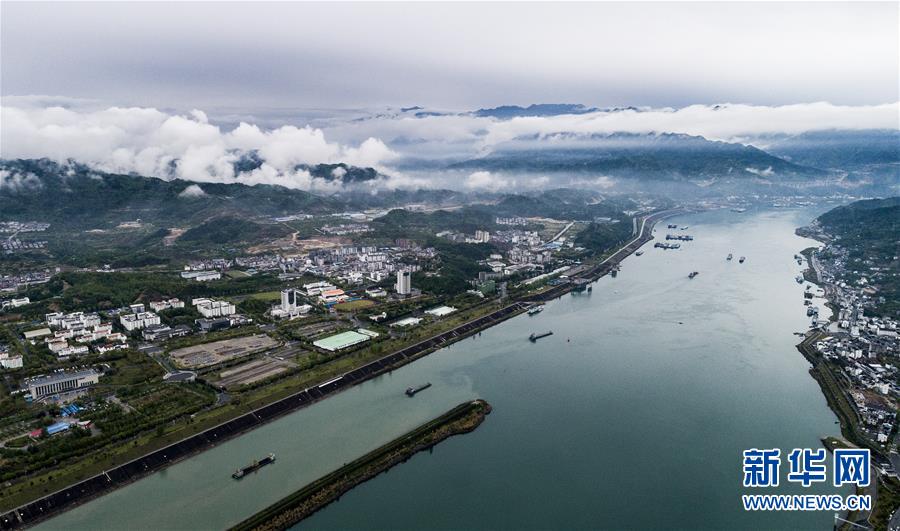 4月18日,船舶行驶在长江三峡五级船闸下游引航道(无人机照片)。 随着复工复产的持续推进,三峡库区水域货运加快恢复,船舶流量逐步增长。 新华社发(郑家裕 摄)