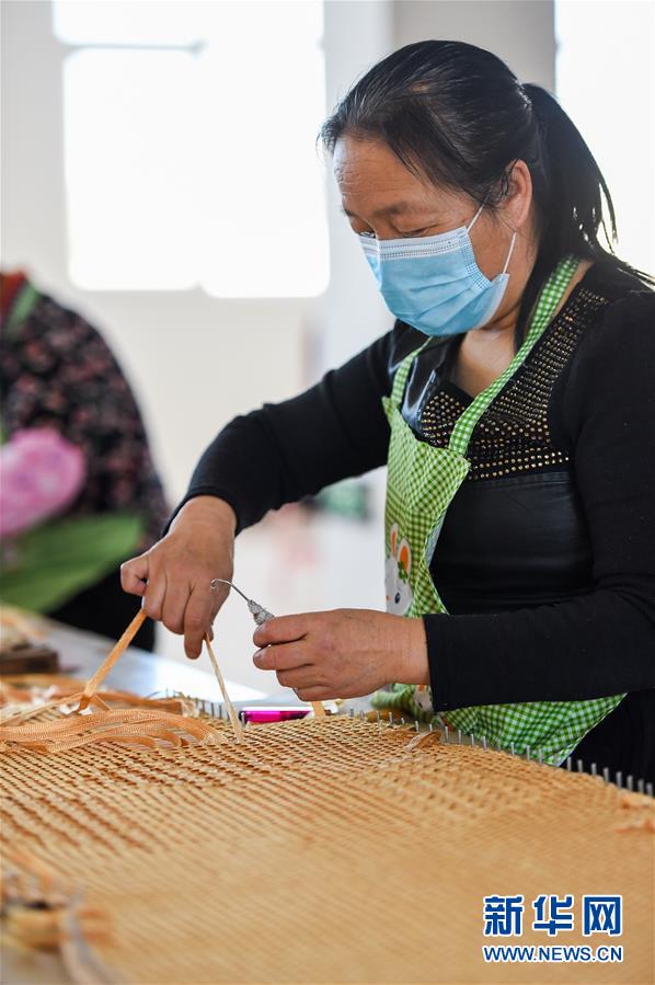 3月27日,福安小区的贫困群众在小区扶贫车间里编织汽车座垫。新华社记者 连振 摄