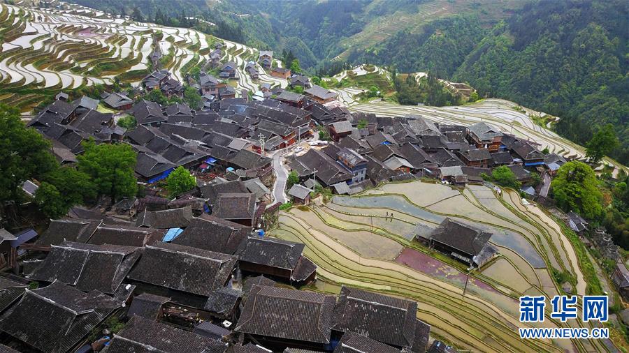4月19日拍摄的贵州省从江县加榜乡加车村苗寨景观(无人机照片)。 贵州省从江县把人居环境整治作为脱贫攻坚工作的一项重要举措来抓,对乡村规划范围内长期无人居住的危房、废弃禾仓、棚圈、柴草房和房前屋后的残垣断壁等进行清理整治,进行复垦复绿,同时开展农户卫生和村寨环境整治,做到乡村环境干净、卫生、整洁,扮靓美丽乡村。 新华社记者 杨文斌 摄
