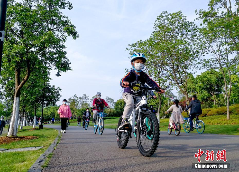 湖北武汉,市民在东湖绿道骑车、乐享春光。中新社记者 张畅 摄