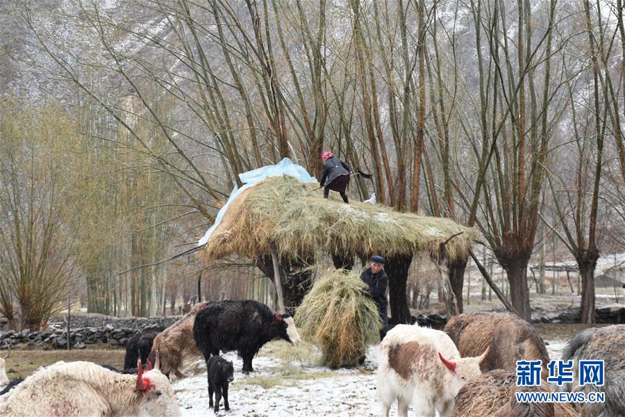 4月20日,艾散·托合提(下)和妻子在牧场为牦牛撒饲草。 艾散·托合提是地处帕米尔高原的新疆阿克陶县红新村牧民,在定居兴牧、脱贫攻坚一系列政策扶持下,艾散·托合提一家在2012年从山上下迁,住进搬迁安置点红新村,住上了砖瓦房,建起了牲畜棚舍。在新疆维吾尔自治区生态环境厅“访民情、惠民生、聚民心”驻村工作队和当地干部的积极引导下,他家的收入越来越高,目前有260多只羊和35头牦牛。2019年,艾散·托合提买了一辆越野汽车,告别骑马放牧,成为帕米尔高原上开车放羊的“新”牧民。 新华社记者 高晗 摄