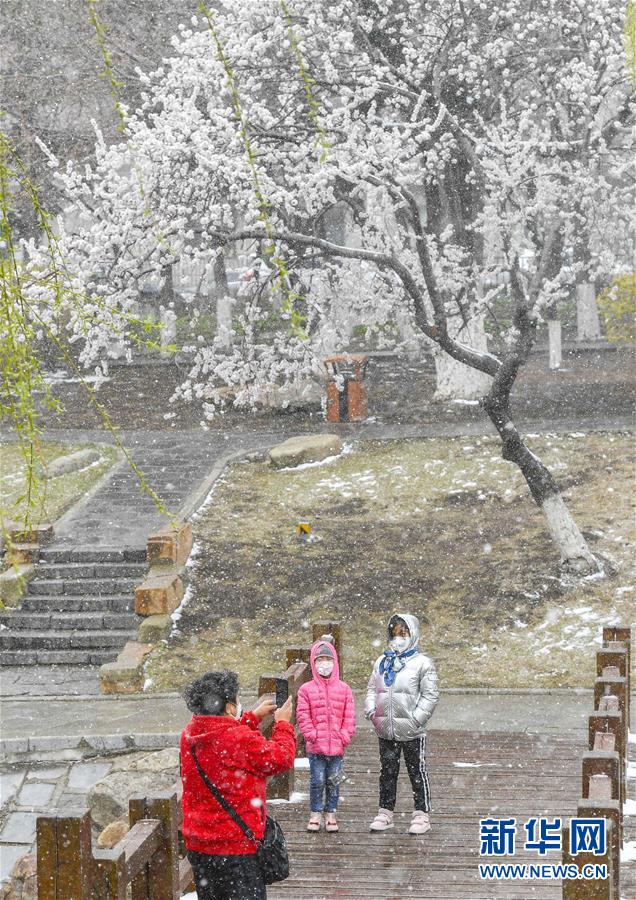 4月21日,在长春市杏花村公园,市民在雪中拍照留念。 当日,吉林省多地迎来降雪天气。 新华社记者 许畅 摄