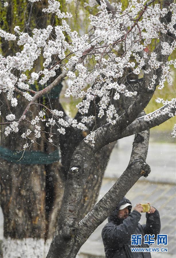 4月21日,市民在长春市杏花村公园拍摄雪景。 当日,吉林省多地迎来降雪天气。 新华社记者 许畅 摄