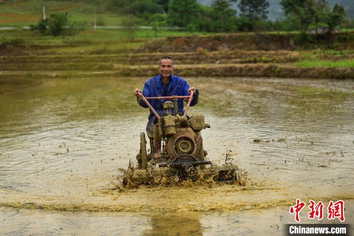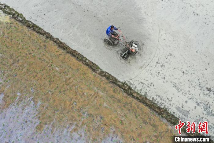 一位农民驾驶微耕机犁田,在田中激起阵阵浪花。 王以照 摄