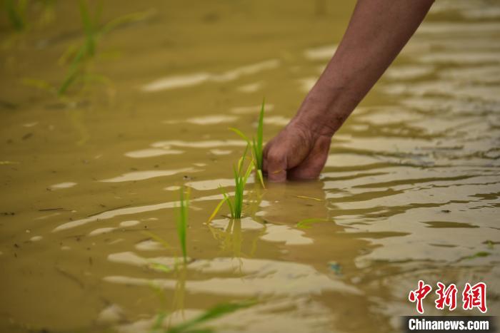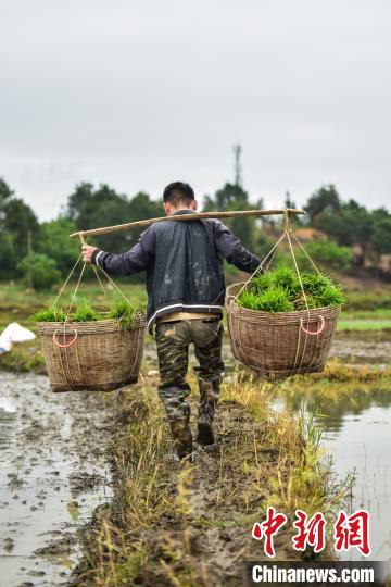 一位农民挑着两筐秧苗在泥泞田埂上走过。 王以照 摄