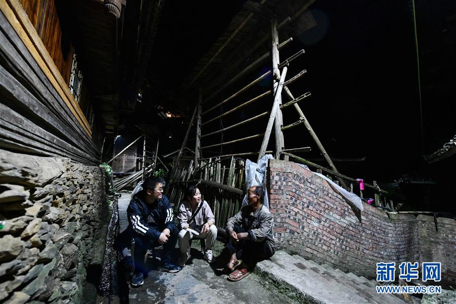 吴贤艳(中)与帮扶干部在夜访贫困户途中与在室外休憩的村民交流(4月18日摄)。 新华社记者 杨文斌 摄