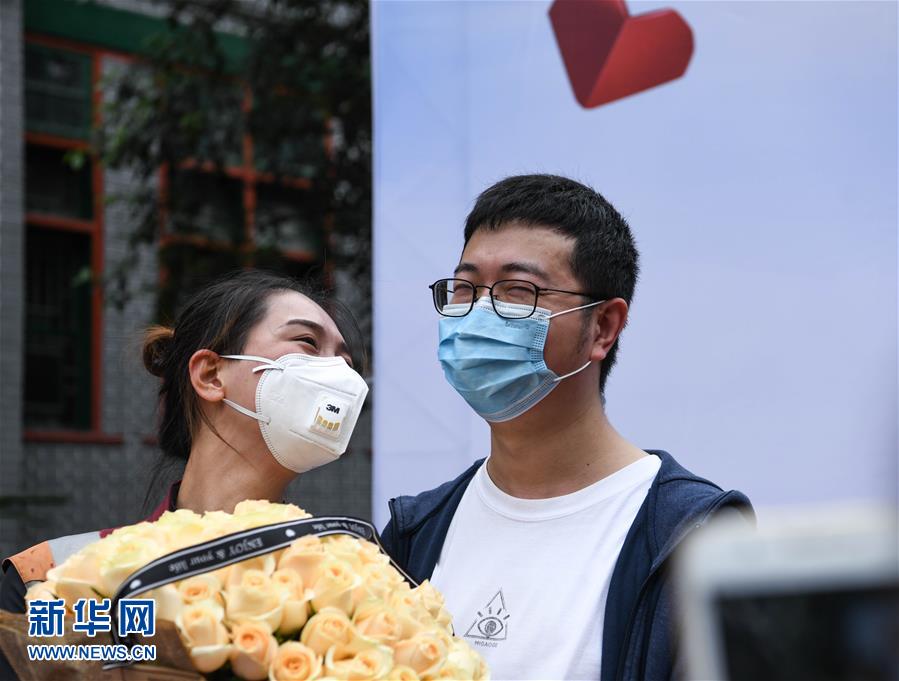 4月21日,在四川大学华西医院,医疗队队员接受男友的捧花。 当日,来自四川大学华西医院、华西第二医院、华西第四医院的医疗队队员解除隔离休整,与分别许久的家人、同事团聚,紧紧相拥。 新华社记者 王曦 摄