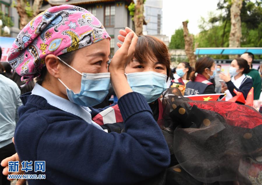 4月21日,在四川大学华西医院,医疗队队员安慰流泪的同事。 当日,来自四川大学华西医院、华西第二医院、华西第四医院的医疗队队员解除隔离休整,与分别许久的家人、同事团聚,紧紧相拥。 新华社记者 王曦 摄