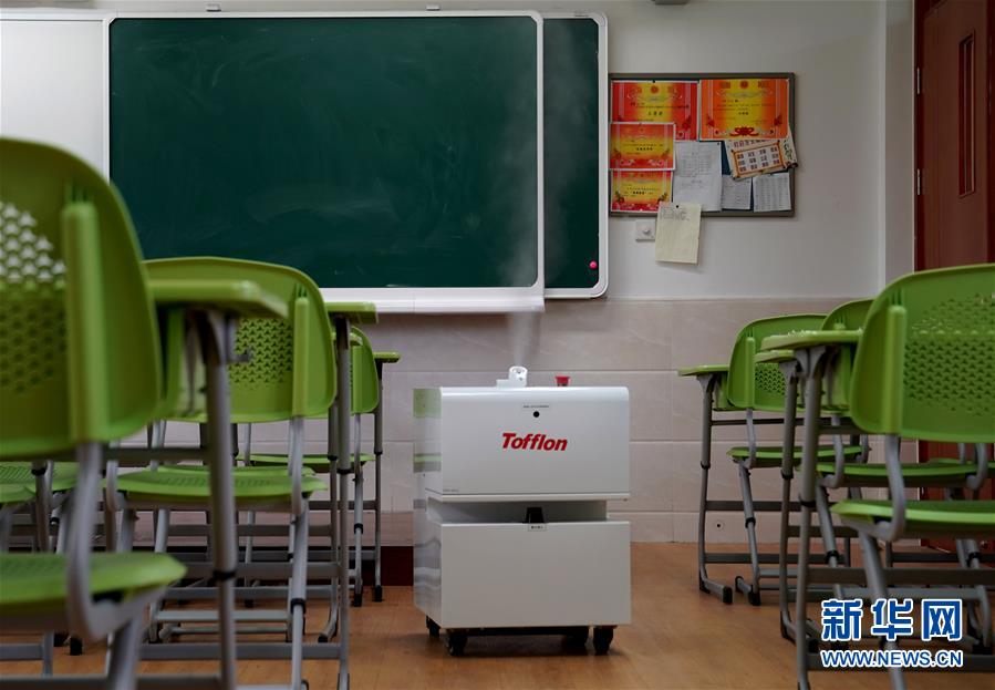 4月21日,消毒机器人在上海市闵行区颛桥中学的初三教室内消毒。 4月27日,上海市高三年级、初三年级将返校开学。上海各中学从出入管理、环境消毒、物资配备、消防安全、应急预案等方面积极准备,运用消毒机器人、高科技测温仪等手段加强校园防疫,保障师生安全顺利返校。 新华社记者 刘颖 摄