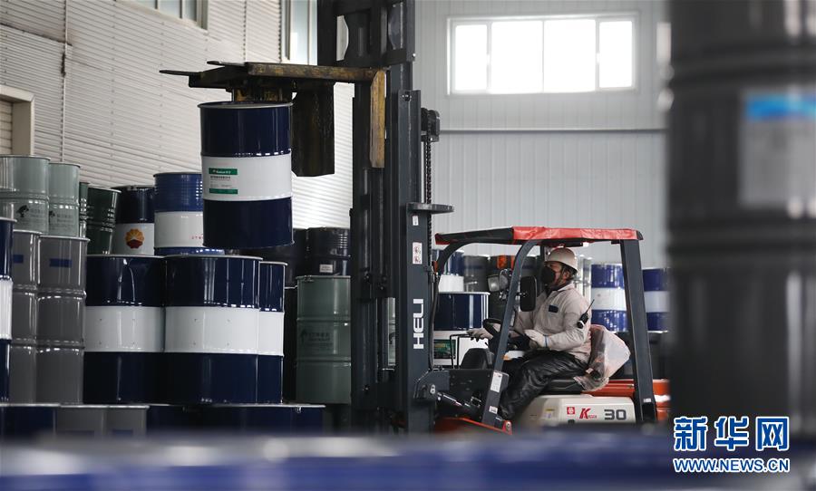 4月21日,在辽宁海华科技股份有限公司润滑油成品库,一名叉车工人在搬运润滑油成品。 近来,辽宁省鞍山市多措并举,帮助民营工业企业解决在复工复产中面临的困难,减税降费减轻企业负担,积极引导民营工业企业提高产业环节附加值,推动企业高质量发展。 新华社记者 姚剑锋 摄