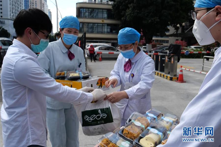郭屹凡(左一)向福建省立医院医务人员赠送咖啡及面包点心(视频截图)。新华社发