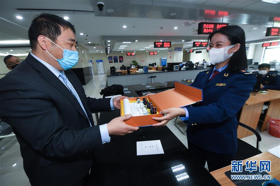4月22日,在湖州市吴兴区政务服务中心内,吴兴区市场监管局的工作人员(右)将包括营业执照、公章、涉企政策宣传资料等在内的创业服务大礼包递给企业开办者,完成了创业企业登记的全部手续。 近期,浙江省湖州市吴兴区“最多跑一次”改革办公室联合吴兴区市场监管局深化“最多跑一次”改革,依托浙江政务服务网、浙里办APP等平台创新推出企业创业服务“大礼包”,将开办企业所需的设立登记、社保登记、公章刻制、领取发票、银行开户等5个环节统一整合为1个环节,推出创业服务大礼包,大幅缩减办理手续的材料、费用、时间,实现“四小时”一站式完成创业企业登记,让群众跑一次、跑一地就可以当上企业主。 新华社记者 徐昱 摄