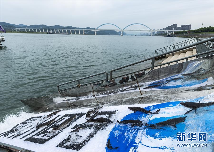 4月22日,中华鲟从放流通道滑入长江。 当日,在湖北省宜昌市的长江珍稀鱼类放流点,一万尾子二代中华鲟放归长江,对自然环境中的中华鲟物种资源再做补充。 新华社发(郑家裕 摄)