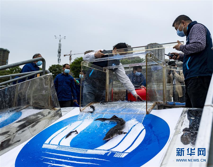 4月22日,工作人员在放流中华鲟。 当日,在湖北省宜昌市的长江珍稀鱼类放流点,一万尾子二代中华鲟放归长江,对自然环境中的中华鲟物种资源再做补充。 新华社发(郑家裕 摄)