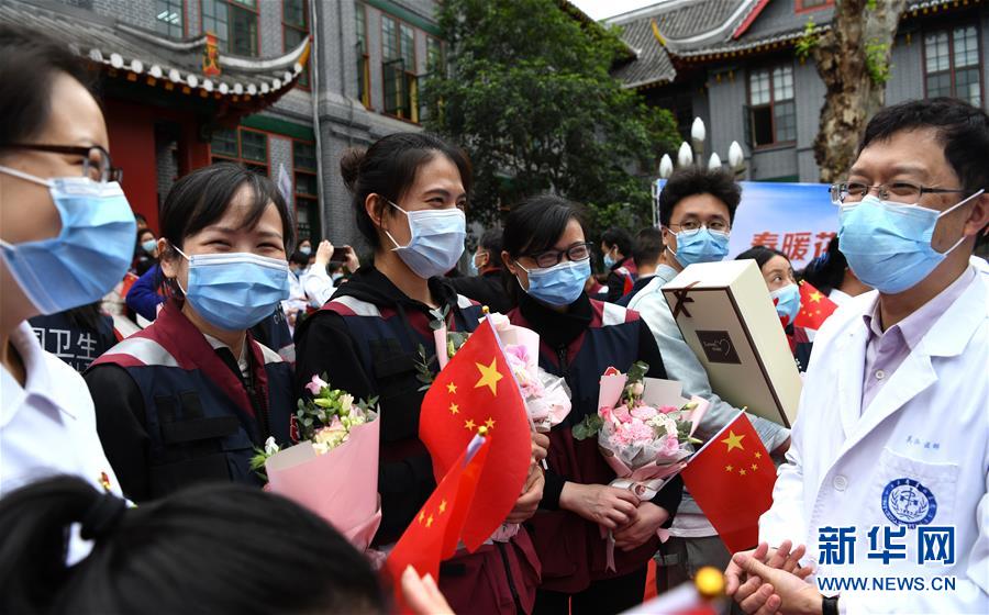 4月21日,在四川大学华西医院,谢泽荣(左三)和同事们交谈。新华社记者王曦摄