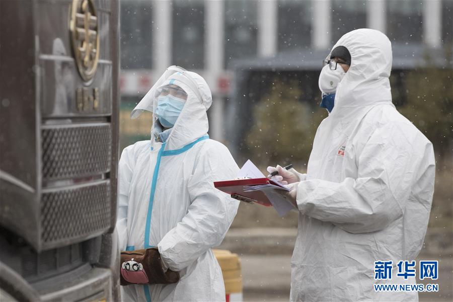 4月22日,在绥芬河市入城口,工作人员在雪中进行登记。 当日,黑龙江省绥芬河市迎来降温降雪天气,遍布小城的防疫工作者坚守岗位。 新华社发(张涛 摄)