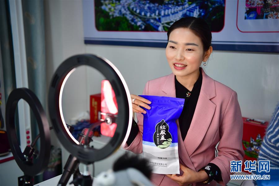 4月22日,在平利县老县镇锦屏社区一间直播间,平利县寻梦农园绞股蓝合作社负责人王秀梅在电商平台上推介平利县特色食品。 近年来,陕西省安康市平利县老县镇着力推动易地扶贫搬迁建设,积极发展社区工厂、农业产业,促使居民稳定就业,脱贫增收。同时,该镇教育、医疗等社区服务功能不断完善,使群众生活有了更好的保障。 新华社记者 邵瑞 摄