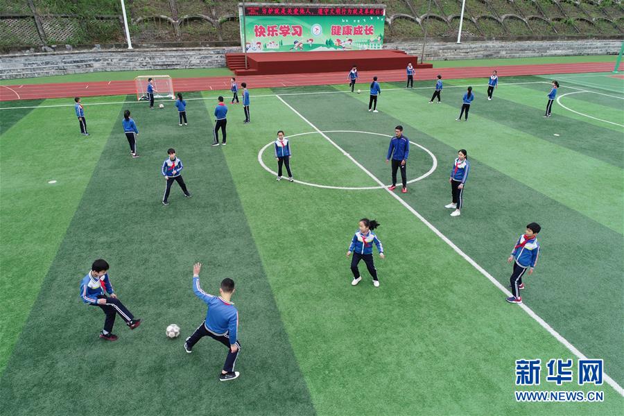 4月22日,平利县老县镇中心小学的学生在操场上踢球(无人机照片)。 近年来,陕西省安康市平利县老县镇着力推动易地扶贫搬迁建设,积极发展社区工厂、农业产业,促使居民稳定就业,脱贫增收。同时,该镇教育、医疗等社区服务功能不断完善,使群众生活有了更好的保障。 新华社记者 邵瑞 摄